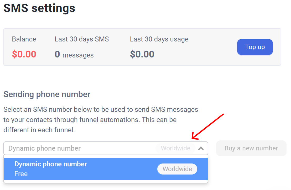 If you're new to SMS as a digital marketing tool, this might be a good option. Add funds to the SMS account **one time** and start sending messages. When the balance hits zero, your funnel **stops** sending messages, and **no funds are added** to the balance **until you make a new payment** or set up an auto top-up.