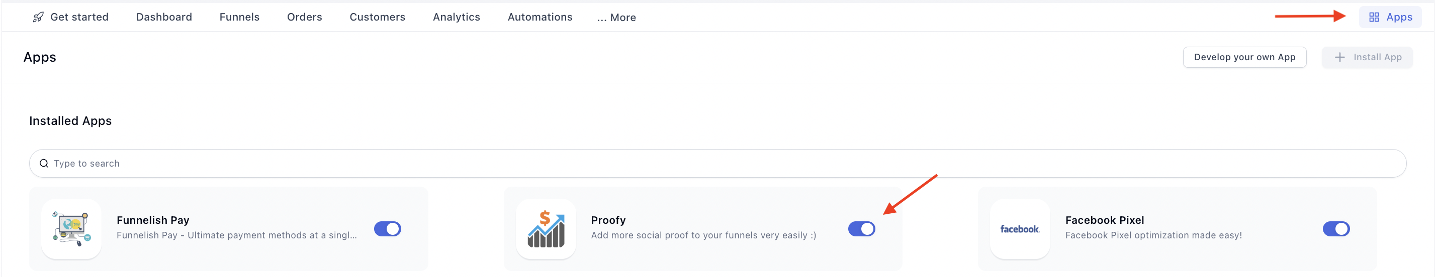 2. Click the [**Funnel apps** ](https://docs.funnelish.com/apps-overview#id-2.-funnel-apps-per-funnel)> **enable Proofy inside the funnel as well.**