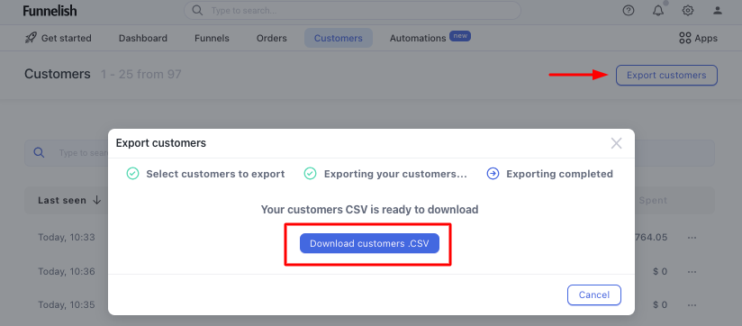To export your orders, click the **Export customers** button. Choose the type of data you want to export (by Date or All Customers) and then download the .csv file.&#x20;