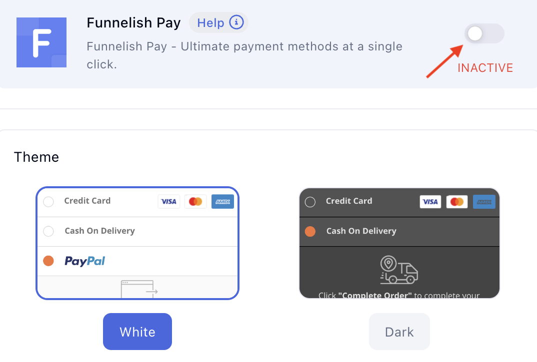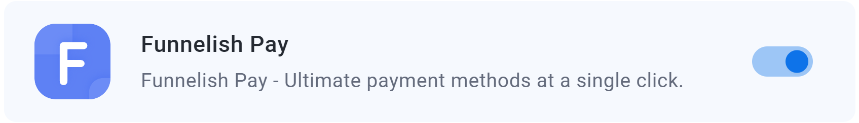<figure><img src="https://2613769297-files.gitbook.io/~/files/v0/b/gitbook-x-prod.appspot.com/o/spaces%2F-M1AQCa9ckIWH7hGfrUV%2Fuploads%2FrZRWsaBFSbwCyHVyeVHE%2FFunnelish%20Pay%20toggle%20enabled.png?alt=media&#x26;token=85e860ab-ea9c-49db-9060-a85211deca02" alt=""><figcaption><p>Toggle the switch to the enabled position.</p></figcaption></figure>