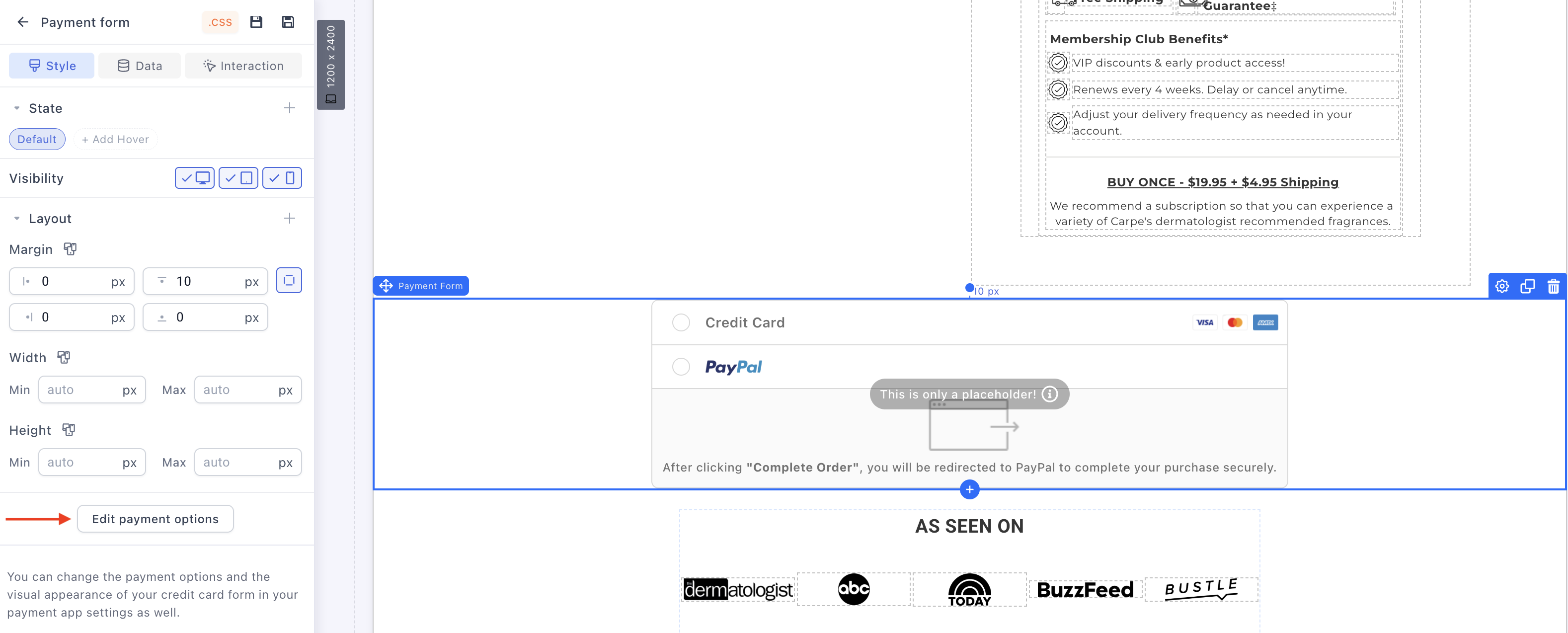 3. Click the **payment form** field to display the settings panel on the left.