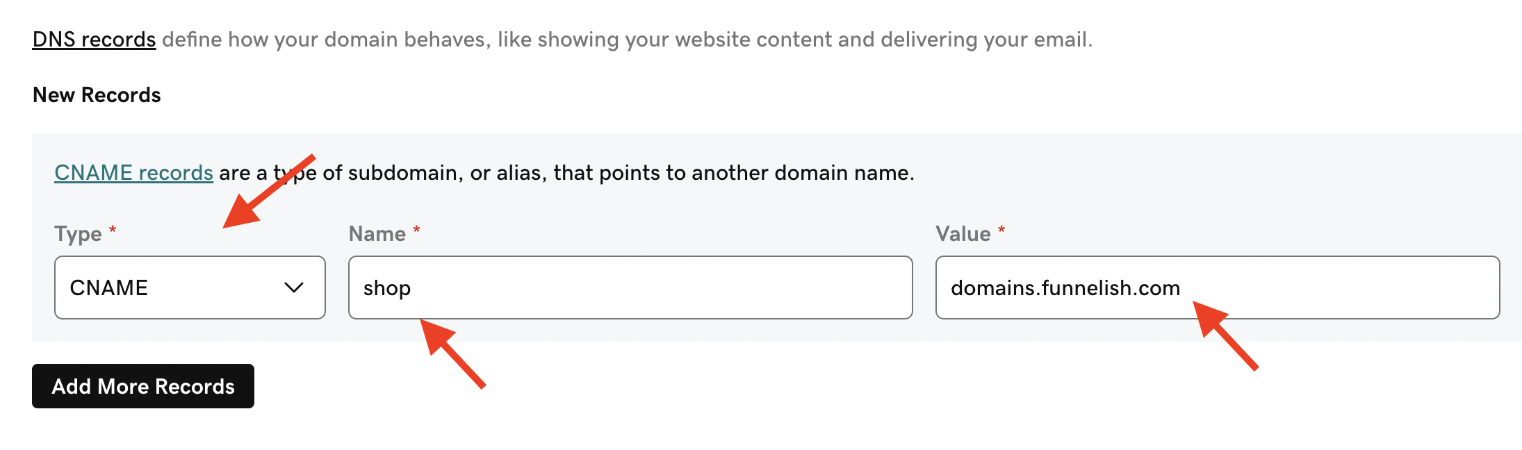 3. Copy and paste “**domains.funnelish.com**” to the **Points to / Value** field.