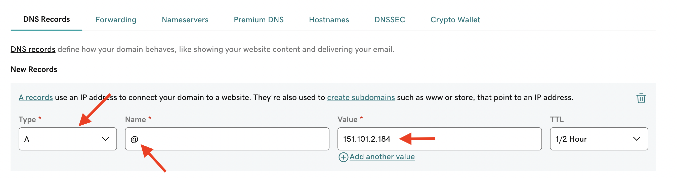 3. Copy and paste this IP address “**151.101.2.184**” to the **Points to / Value** field.